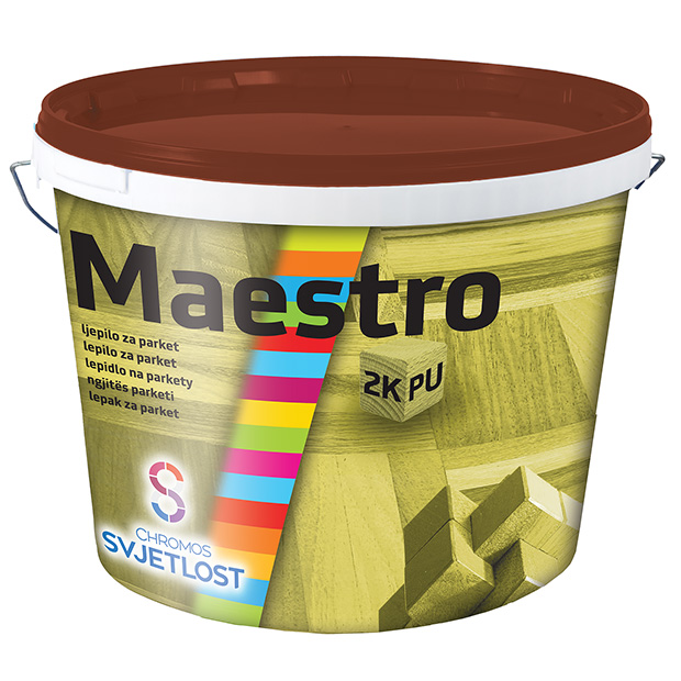 MAESTRO 2K PU ljepilo za parket je dvokomponentno poliuretansko reakcijsko ljepilo bez dodatka vode i otapala za lijepljenje svih vrsta parketa, pločica od prirodnog kamena, keramičkih pločica i metala na upijajuće i neupijajuće betonske, drvene i druge podloge. Smjesa je vodo i temperaturno otporna.