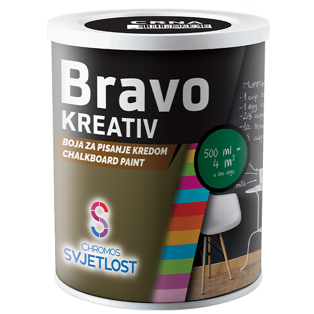 BRAVO KREATIV táblafesték - magas minőségű festék fal és fa felületekre, rugalmas bevonatot képez, melyre krétával írni lehet. Kopásálló és vízzel mosható.