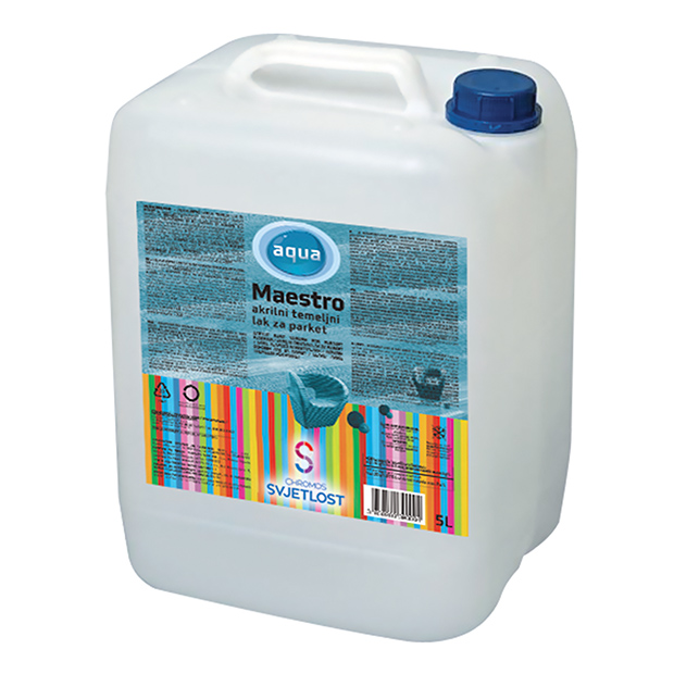 AQUAMAESTRO AKRILNI TEMELJNI LAK ZA PARKET je vodni akrilno-poliuretanski enokomponentni brezbarvni temeljni lak. Odlikuje se s svilenkastim sijajem in polnostjo filma. Odlično zapolnjuje pore in manjše fuge. Je trd in se odlično brusi.